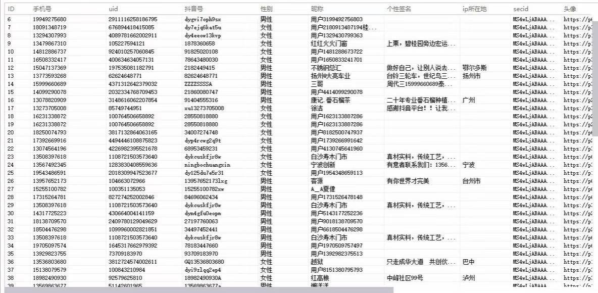 可查询到的信息包括手机号、抖音号、UID、性别、昵称、个性签名、所在地、头像等信息